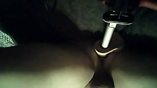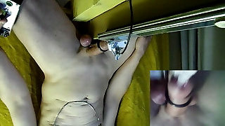 Fuckmachine, nipple clams, buttplug, stockings and high stilettos.