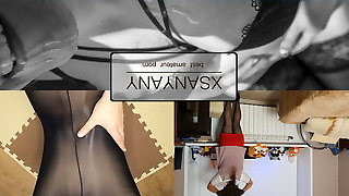 Secretary in a green office garment. Wanilianna in green outfit playing as a crazy stockinged and perverted assistant