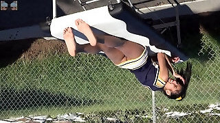POV: Cute schoolgirl with pigtails smiles, crosses her gams and showcases what's under her skirt
