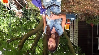 Anorexic brunette hussy gets her slim body corded up to wooden fence outdoors