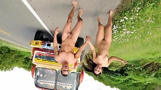 Two sexy girls caress each others pussies in the street